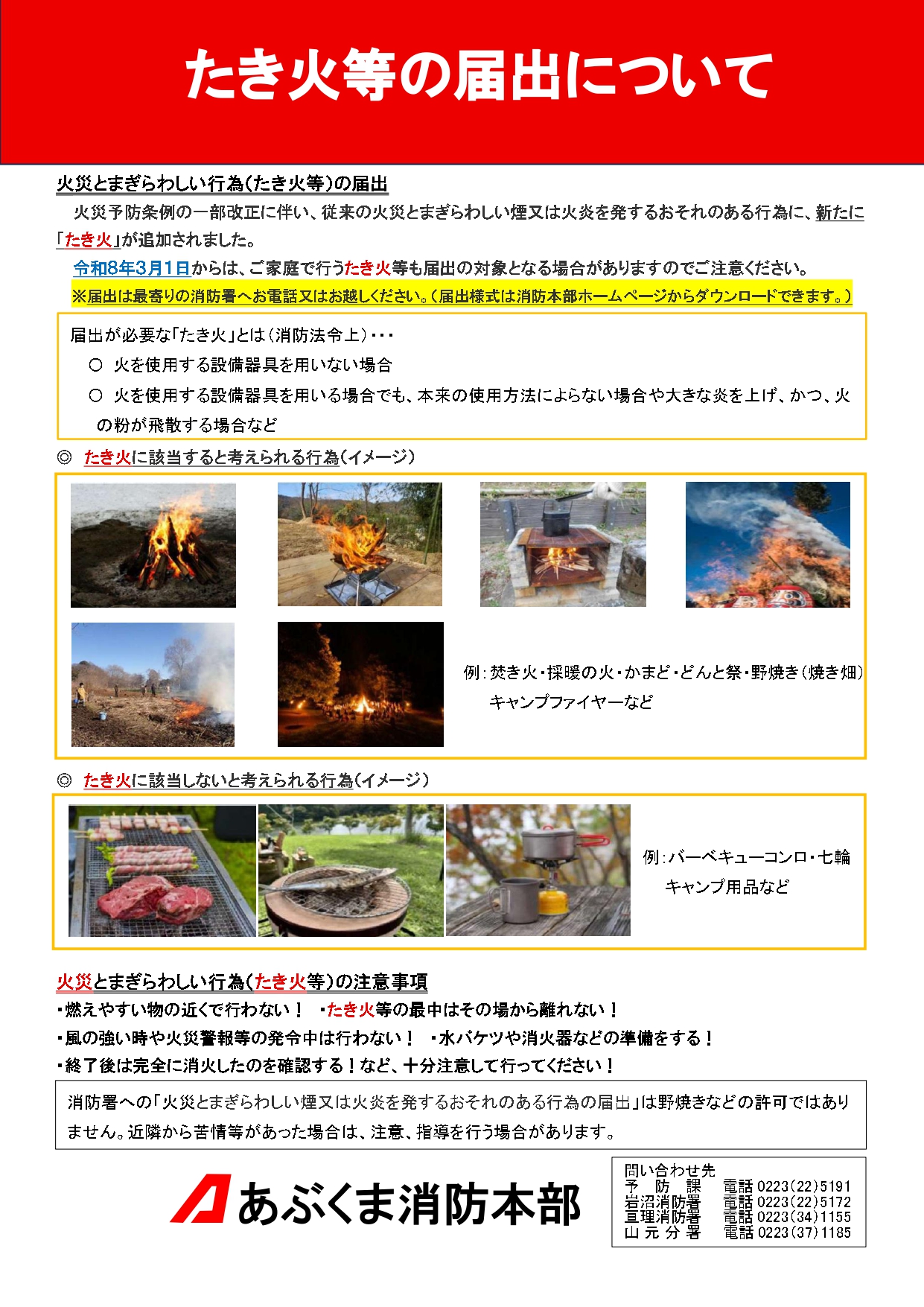 火災予防条例の一部改正に伴い、従来の火災とまぎらわしい煙又は火炎を発するおそれのある行為に、新たに「たき火」が追加されました。