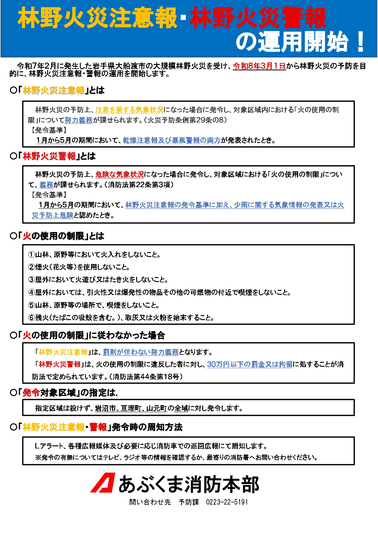 岩手県大船渡市で発生した大規模林野火災を受けて、令和8年3月1日から林野火災の予防を目的とした「林野火災注意報・警報」の運用を開始します。